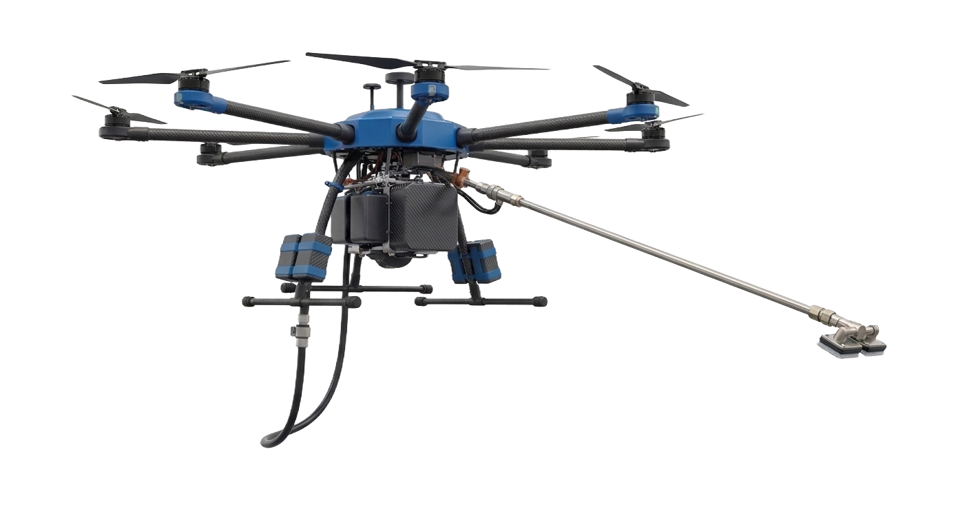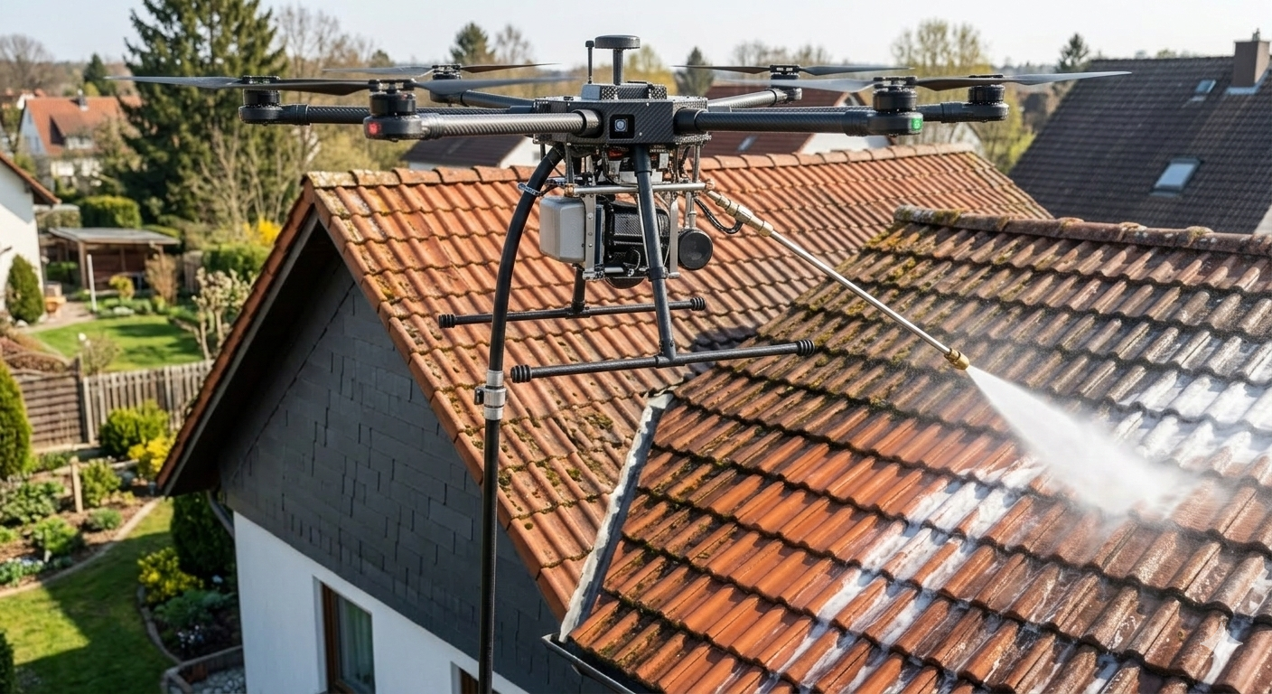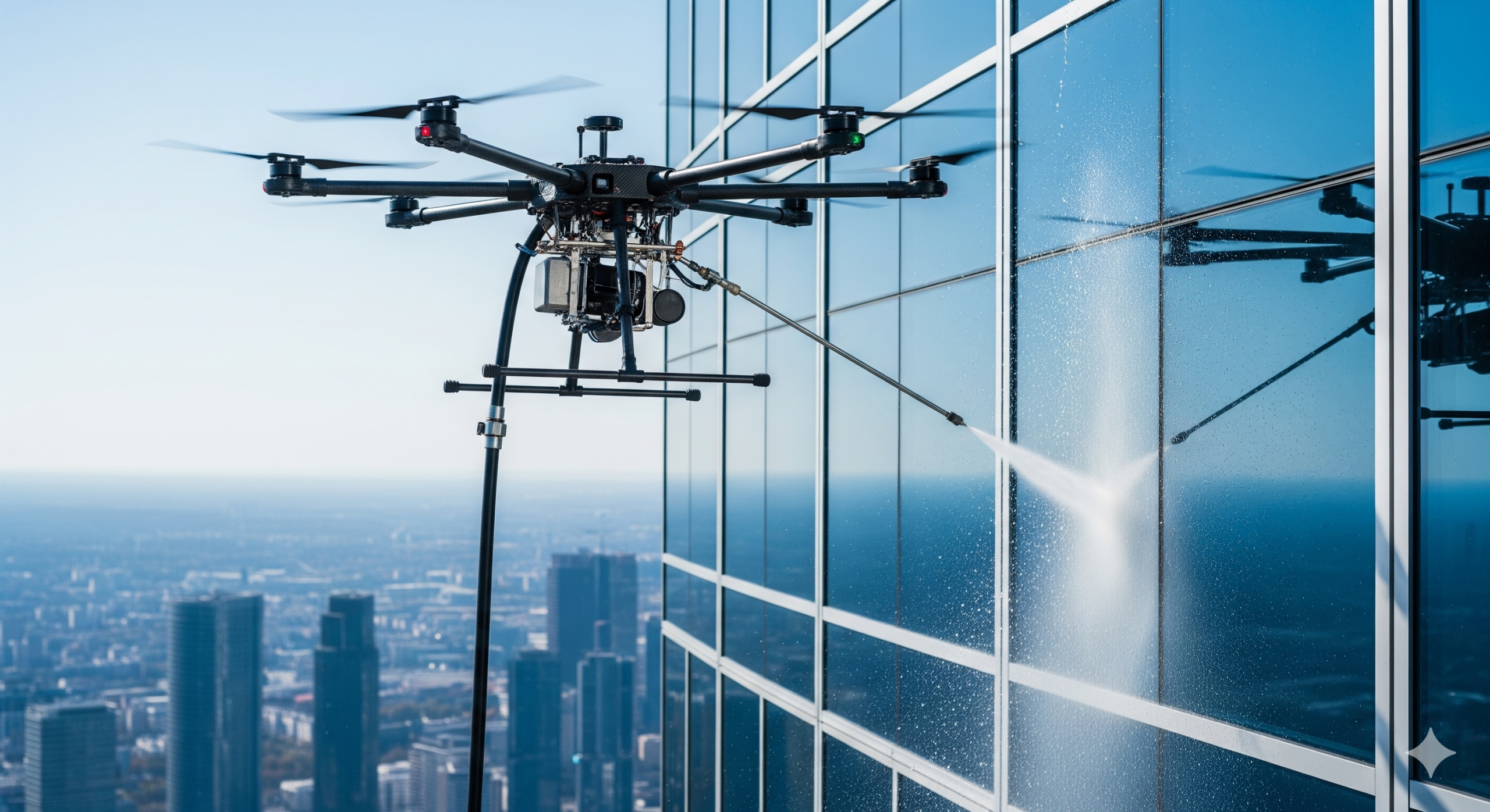 Pół-Autonomiczny System Myjący: Specjalistyczny dron przemysłowy, zaprojektowany do precyzyjnego mycia elewacji, szyb i dachów na wysokościach.